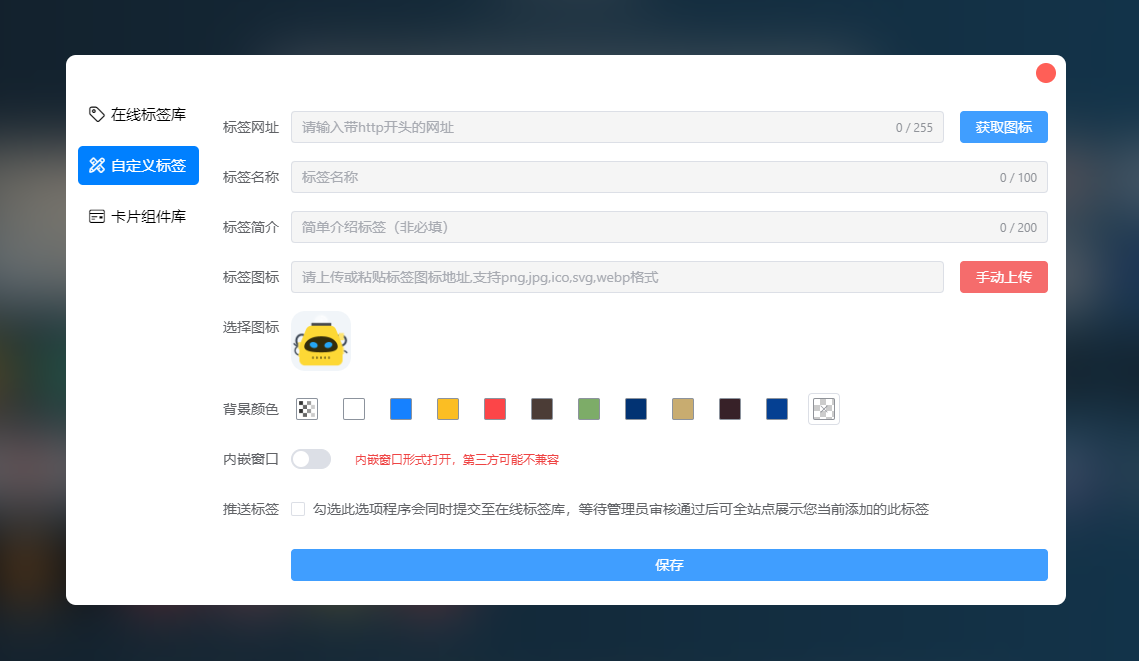 如果您是添加您自己的网址,请选择自定义标签,卡片组件请点击卡片组件库添加,或者可以看看在线标签库推荐的一些图标网址。