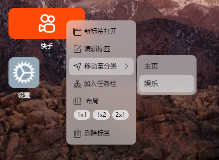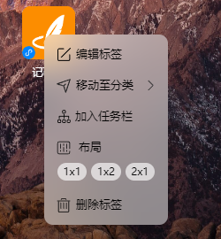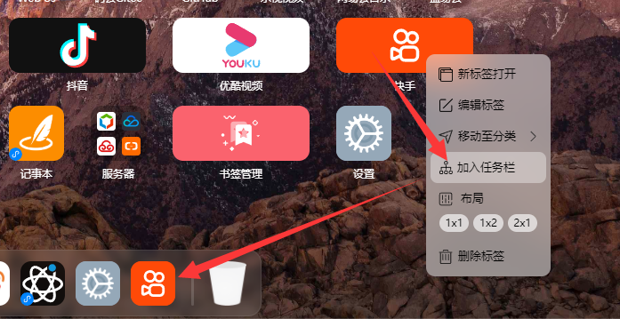 - 可以通过在标签鼠标右键,选择加入任务栏,这样图标就在底部任务栏里面了