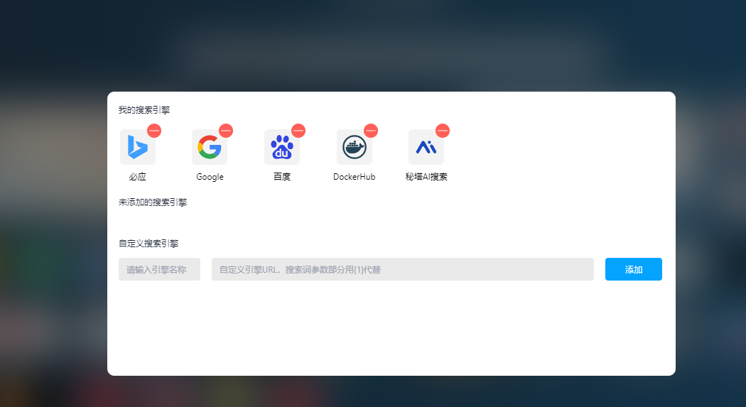 点击进去之后就可以看到自己已经添加的和未添加的搜索引擎,也可以自定义一个自己的搜索引擎,搜索参数词部分用{1}代替。